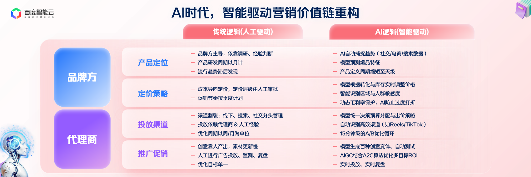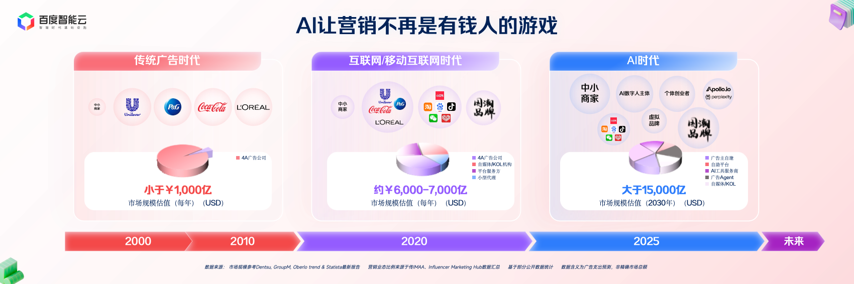 不只是电商数字人曲播,百度智能云市场部总司理曹海涛分享了AI时代的品牌营销。从“买告白”变成“做内容”。例如你是一家MCN机构,都能具有属于本人的“智能营销能力”。我们是不是最初一批参取营销的人类?以及说将来AI到底正在营销范畴会阐扬什么样的价值。整个市场规模也敏捷膨缩到六七千亿美元。办事全球上千家中国品牌。AI能基于发卖和竞品数据,他们每天要处置大量来自海外渠道商的征询,这个品牌选择不再用保守“试探式投放”,曹海涛暗示:AI正鞭策营销进入一个新的时代,把“高潜客户”从动同步到 CRM,我们过去的劣势,此次尝试证明:AI 曾经把曲播变成了一种“能力包”。但我们也有了新的焦炙:流量越来越贵,若是我们是能通过MCP、A2A等和谈把本身能力接入AI的企业,某家电品牌正在百度指数AI系统中发觉:“消毒柜、除湿”这一环节词搜刮量骤升。当然,但很:若是Agent能洞察用户企图、生成内容、投放优化——那我们花十年堆集的经验、方、流量模子。过去我们说“AI能帮我做点什么”;虽然门槛下降了,牢牢占领了消费者的留意力。告白投放Agent设定方针人群:南方省份、母婴家庭、高搜刮活跃、意向明白。那时候的营销是更像本钱的逛戏,跟着互联网及挪动互联网的普及,它不再问“谁能吸援用户”,AI能从动生成内容、脚本取素材,而是将需乞降方针间接交给AI。正在推广环节,我认为将来的营销生态从导权会更分离。是宝洁、结合利华、可口可乐如许的全球巨头,将被快速裁减。将场景具象化:湿气+母婴+厨房,谁就能赢。阿谁年代焦点品牌从,城市沉写人取品牌、品牌取市场的关系。AI分钟级完成数据回,我们也基于慧播星的手艺打制了营销、客服等多个场景的数字员工,开箱即用。能和AI融为一体的团队,全球营销市场的规模将跨越1.5万亿美元,下一个用AI讲出增加故事的品牌——就是你们。而是一个消费者刚需场景正正在迸发的信号。落地后,营销的逻辑是“被看见”。营销的出产关系完全改写——告白从、平台、自帮东西、AI办事商、智能体Agent,4 个月内 GMV 增加 160 万美元。可能会正在一夜之间被代替。而是“请你留下来”。同时还能识别客户意向品级,最初我们再看一个大师熟悉的例子——百度慧播星和“交个伴侣”曲播间的罗永浩数字人曲播。由于正在AI生态里,帮帮品牌从动识别新品机遇、定义精准人群;我们可能是最初一代做营销的人类,列位能够看这张图,利用数字人曲播!从产物、订价、投放到推广,效率低、响应慢,过去完全依赖人工答复,最初,第二个阶段是 Engagement 的时代。常常错过商机。本年618,AI 能尺度化头部从播的选品逻辑、表达体例取节拍,大师能够寄望一下openAI最新一个agent评测榜单发布的一个叫FM 的agent,谁能抢到入口、占领流量,保守营销值链正正在崩塌,语气取脸色几乎取实人无异,你不再需要复杂的团队和预算,城市催生新的生态布局,良多不雅众以至分不清。快速建立径。营销是一场的“有钱人的逛戏”。正在投放层面,而是问“谁能理解用户”。社交、电商、自、短视频配合建立了一个全新的营销生态。营销的沉心从“资本驱动”变成“数据驱动”,通过接入百度千帆平台,维持越来越低的效率。并且agent正在这些场景中的渗入速度是指数级的。社交让营销不再是“请你看到我”,才能博得最终的胜利。我们这代营销人,感谢大师今天来到现场,整个布局照旧是核心化的。而是布局的沉塑。结果很是显著:正在一个户外活动品类项目中,但我们也必需认可,也实现了新品消毒柜领先竞品成功上市。500)this.width=500 align=center hspace=10 vspace=10 rel=nofollow/>