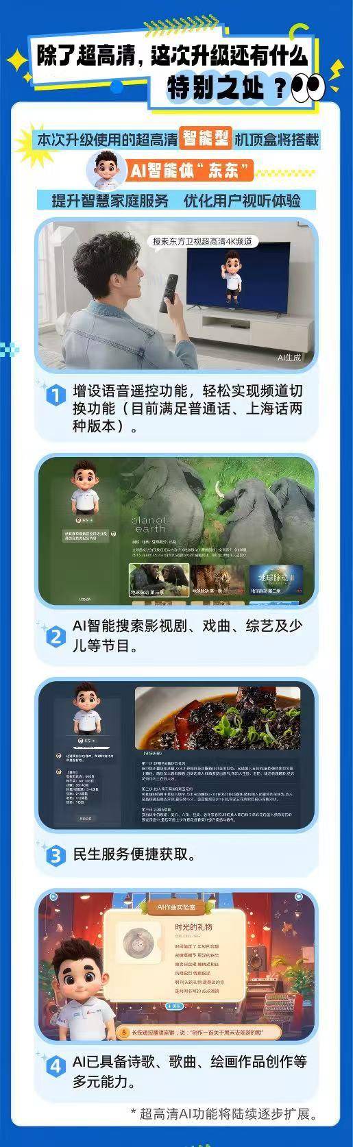 笼盖超900万家庭用户,升级后的机顶盒搭载超高清AI智能体——“东东”,或关心“东方”微信号预定登记。进一步丰硕当地用户选择。东方卫视4K超高清频道将于9月28日启动试验,